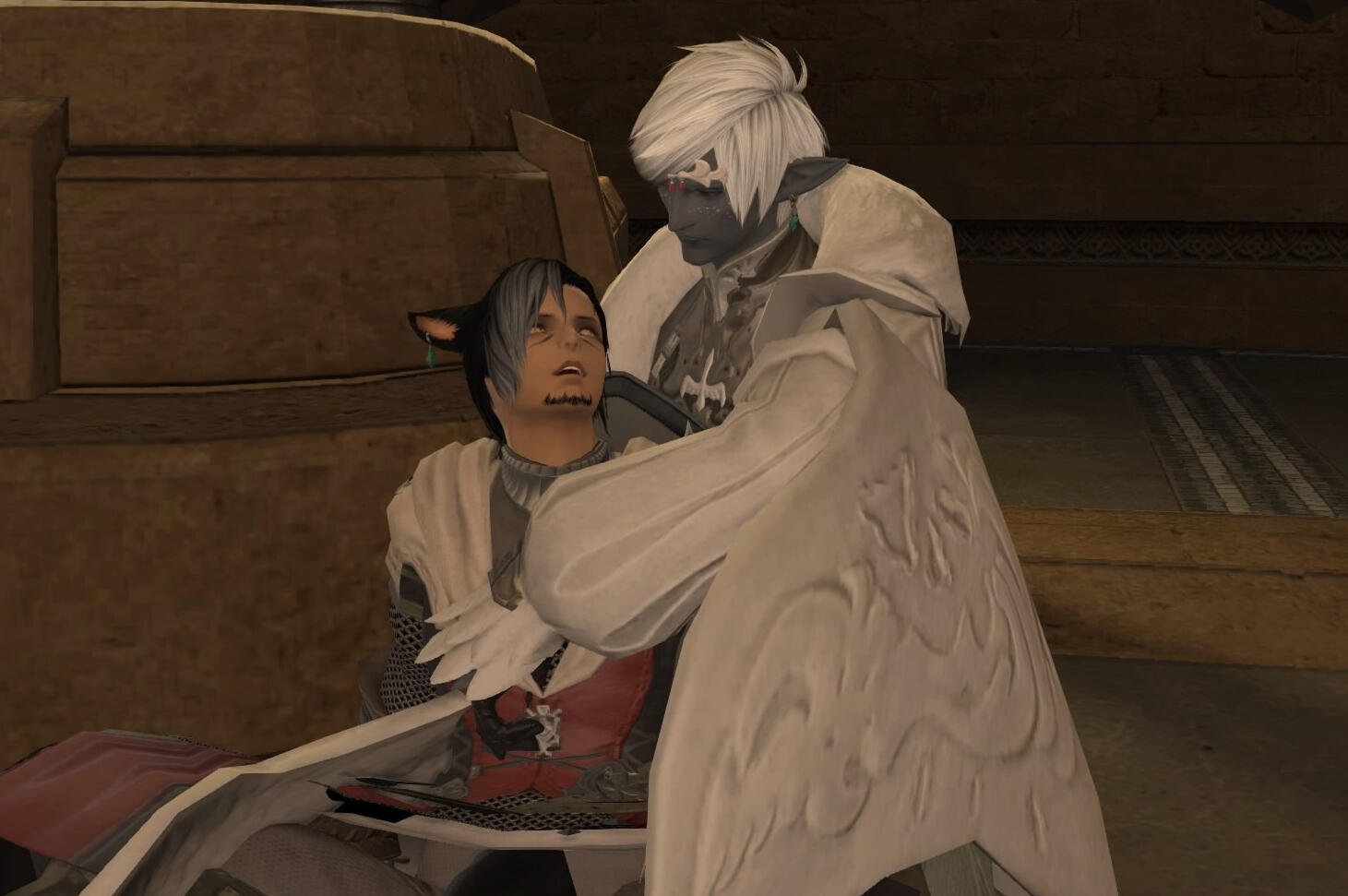 Ivoux openly wept, despite his injuries, when he saw a dirt and dust covered young Aris standing there with him; Aris, in his upset, tried desperately to heal him, casting healing spells recklessly one after the other, pulling from his own aether stores and exhausting himself, causing him to collapse from the exertion. The last thing he remembered was someone pulling him away and holding him before he collapsed. When Aris awoke, Ivoux had finally passed, and Aris went into a state of shock, and sat, unmoving, for hours while his brother’s body was prepared for transport back home to Gridania. It wasn’t until a young Au’ri male, his head still bleeding slightly from a loosely bandaged wound, approached him and inquired about his wellbeing. The Au’ra revealed then that he had caught Aris earlier and held him when he had collapsed, having borne witness to what had happened. Aris initially scoffed about the Au’ri male’s own state before he dissolved into a full mental breakdown. The Au’ra pulled him into a tight hug while Aris cried angrily and cursed everything before collapsing from the exertion again.